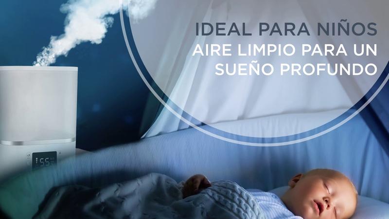 Apto para niños: su amplio depósito de agua de 2,5 L le permite funcionar ininterrumpidamente hasta 12 h y su diseño consigue un funcionamiento extraordinariamente silencioso (30 dBA) a velocidad mínima y en función de vapor frío, perfecto para que los niños duerman sin molestias Humidificación potente: su potente salida de vapor de 380 ml/h consigue una rápida humidificación y las aberturas de la salida del aire son orientables (360°), lo que garantiza una dispersión uniforme por toda la habitación y lo convierte en una opción ideal para habitaciones tanto pequeñas como grandes (de hasta 50 m2) Humidificación inteligente: este humidificador de aire dispone de 3 modos de funcionamiento para ajustar el nivel de humedad a tus necesidades: modo confort automático (nivel de humedad óptimo según la temperatura de la habitación), modo noche y modo manual (de un 30 % a un 70 % de humedad) Acción limpiadora: la función de vapor caliente mata el 99,9 % de las bacterias de las gotas de agua*, garantizando la limpieza del aire difundido para tu total tranquilidad y la de tu familia Uso y mantenimiento fácil: a diferencia de la mayoría de los humidificadores disponibles en el mercado, Aqua Boost se rellena desde la parte superior, permitiendo verter el agua directamente desde arriba para mayor comodidad y rapidez, además, como permite acceder fácilmente al depósito de agua, ofrece una limpieza sin esfuerzo Prácticas prestaciones: este humidificador de casa también dispone de una pantalla digital led, un hidrómetro, un temporizador de hasta 12 horas con apagado automático y asas integradas para mayor comodidad de uso
