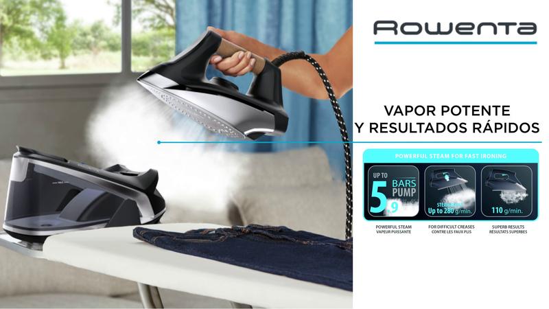 Tu kit Easy Steam de Rowenta, Centro de planchado de alto rendimiento, 110 g/min de salida de vapor continua, 280 g/min de golpe de vapor, Bomba de 5,9 bares de presión, Depósito de agua de 1,4 L, modo Eco