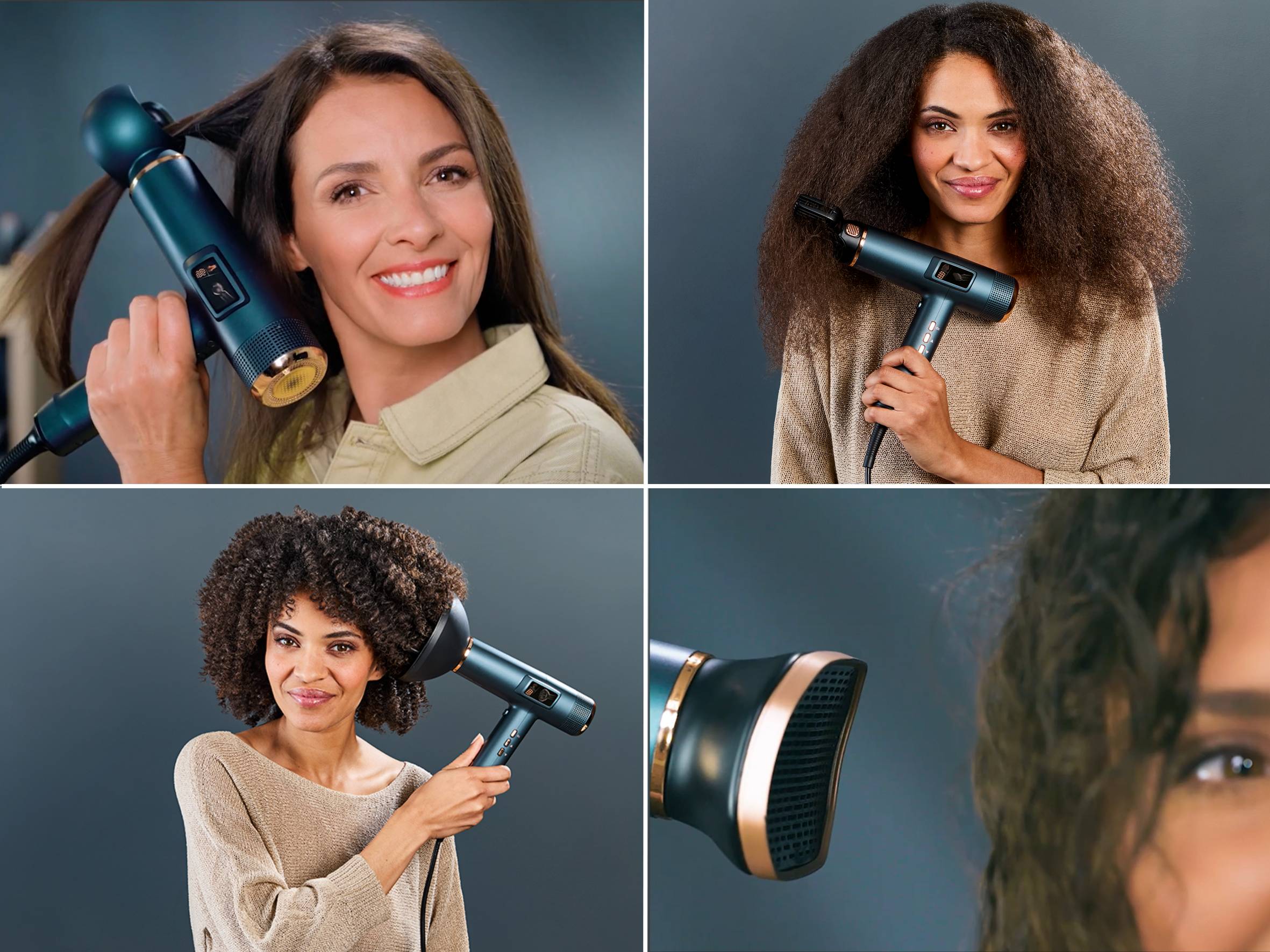 Resultados de peinado óptimos con 4 opciones de peinado: desde cabello rizado y fino a encrespado y grueso. Simplemente selecciona tu tipo de cabello y deja que Maestria For You haga el resto. Utiliza los accesorios para completar tu look: secado liso con Air Smooth Pro, secado suave con la boquilla, rizos definidos con el difusor y secado delicado con el difusor de cabello delicado.