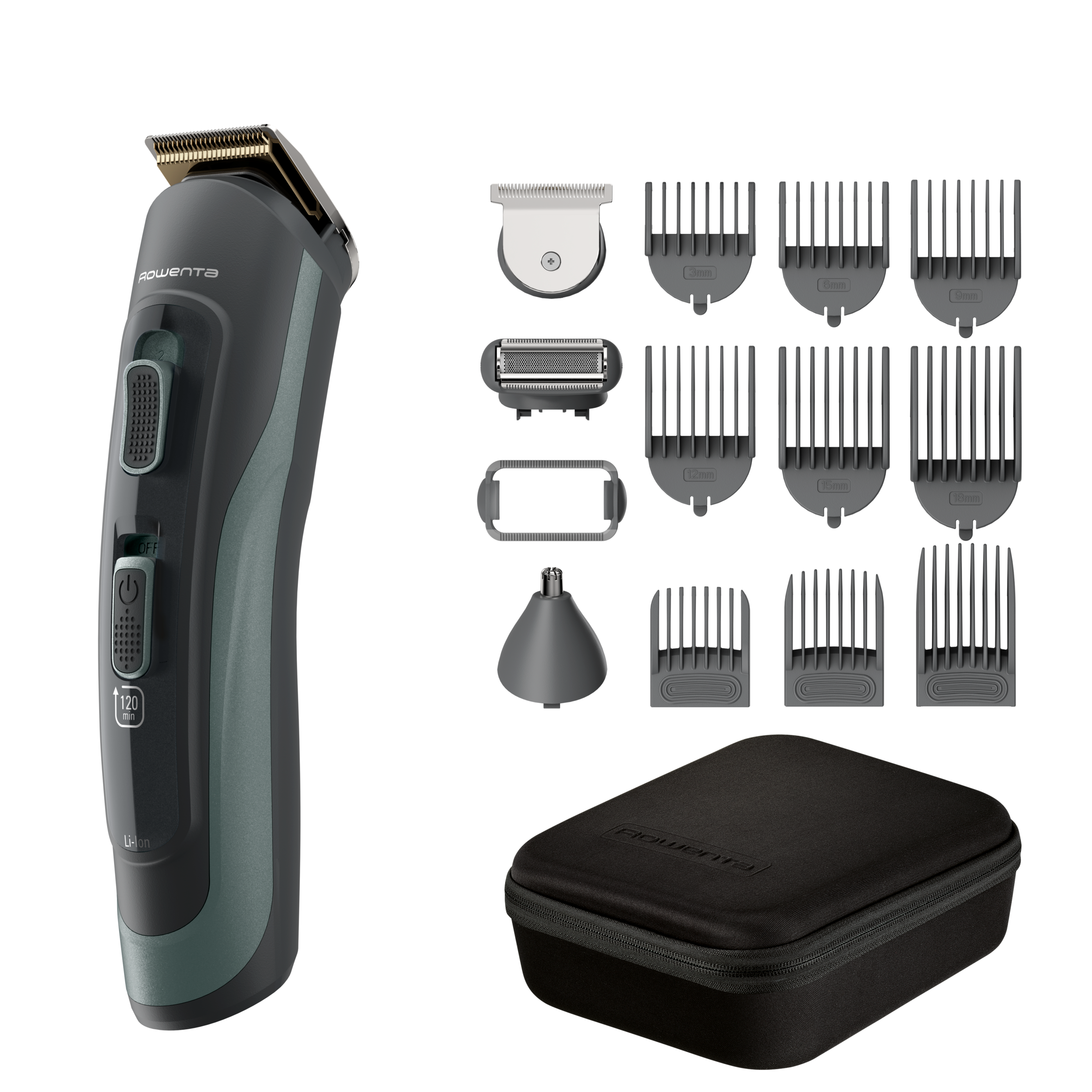 CUCHILLAS QUE DURAN 15 AÑOS: multiaccesorios para hombre con cuchillas hechas para durar 15 años [Prueba interna de resistencia de las palas según el protocolo del Grupo SEB sobre 30 productos, 2020]. RENDIMIENTO DE CORTE DURADERO: cuchillas de acero inoxidable con revestimiento de titanio para garantizar un afilado duradero y un corte perfecto de una sola pasada DOMINA CUALQUIER ESTILO: un multiaccesorios 15 en 1 de alta precisión para hombre que estiliza la barba, corta el pelo y mantiene el vello facial y corporal, con una serie de herramientas que te mantienen con un aspecto impecable ALTA PRECISIÓN: longitudes de corte de 0,5 a 18 mm con 3 peines ajustables y 6 peines fijos, además de un ajuste de precisión de 0,5 mm que se activa con el botón superior GRAN AUTONOMÍA: la batería de ion de litio ofrece hasta 120 minutos de potencia constante, además de una función de carga rápida de 90 minutos FÁCIL SUPERVISIÓN: el indicador LED de batería inteligente te permite comprobar con facilidad el estado de la batería para que siempre sepas cuánta carga queda A PRUEBA DE AGUA: tecnología Wet & Dry para un uso opcional bajo la ducha, con cuchillas lavables que garantizan una limpieza fácil y una higiene impecable ¿QUÉ HAY EN LA CAJA?: multiaccesorios, cuchilla para barba de 32 mm, 3 peines ajustables para barba, cuchilla para el pelo de 44 mm, 6 peines fijos para el pelo (3- 12 - 9 15- 6 18), afeitadora corporal, accesorio para el confort de la piel, accesorio para orejas y nariz, neceser, cargador, cepillo de limpieza
