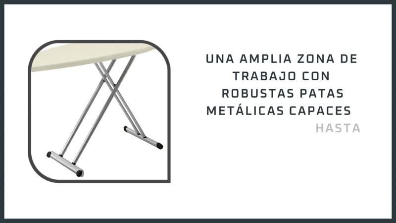 Elegante y robusta tabla de planchar diseñada para un planchado cómodo y suave Una amplia zona de trabajo con robustas patas metálicas capaces de soportar hasta 40 kg Malla metálica de larga duración y cubierta de algodón grueso para una total durabilidad Diseño inteligente que incluye un compartimento de acero inoxidable para apoyar el dispositivo de planchado Altura fácilmente ajustable (de 70 cm a 93 cm) para un planchado más cómodo Ruedas incorporadas para facilitar la movilidad, el transporte y el almacenamiento