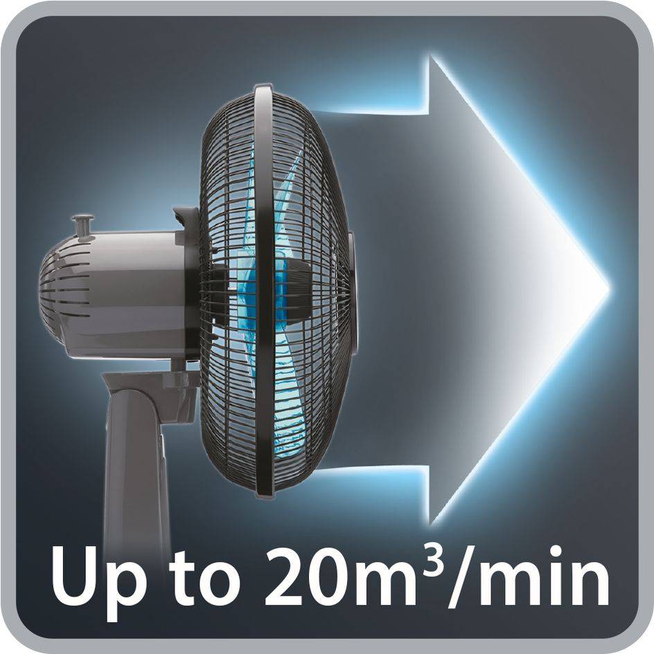 El ventilador de mesa Essential Compact combina un diseño que permite ahorrar espacio con una rejilla reforzada de huecos muy pequeños*, para ofrecer la máxima seguridad y un uso sin preocupaciones. El gran caudal de aire de este modelo de ventilador ergonómico que se transporta fácilmente proporciona una sensación inmediata de frescor de hasta 20 m³/min**. Puede guardarse o colocarse cómodamente en un escritorio, una mesilla de noche o cualquier otra mesa de la casa, pero al mismo tiempo no renuncia al rendimiento. Puedes ajustarlo en función de tus necesidades gracias a sus dos velocidades de caudal de aire. *Rejillas más seguras en comparación con la norma de seguridad europea n.° EN60335-1 (2012)