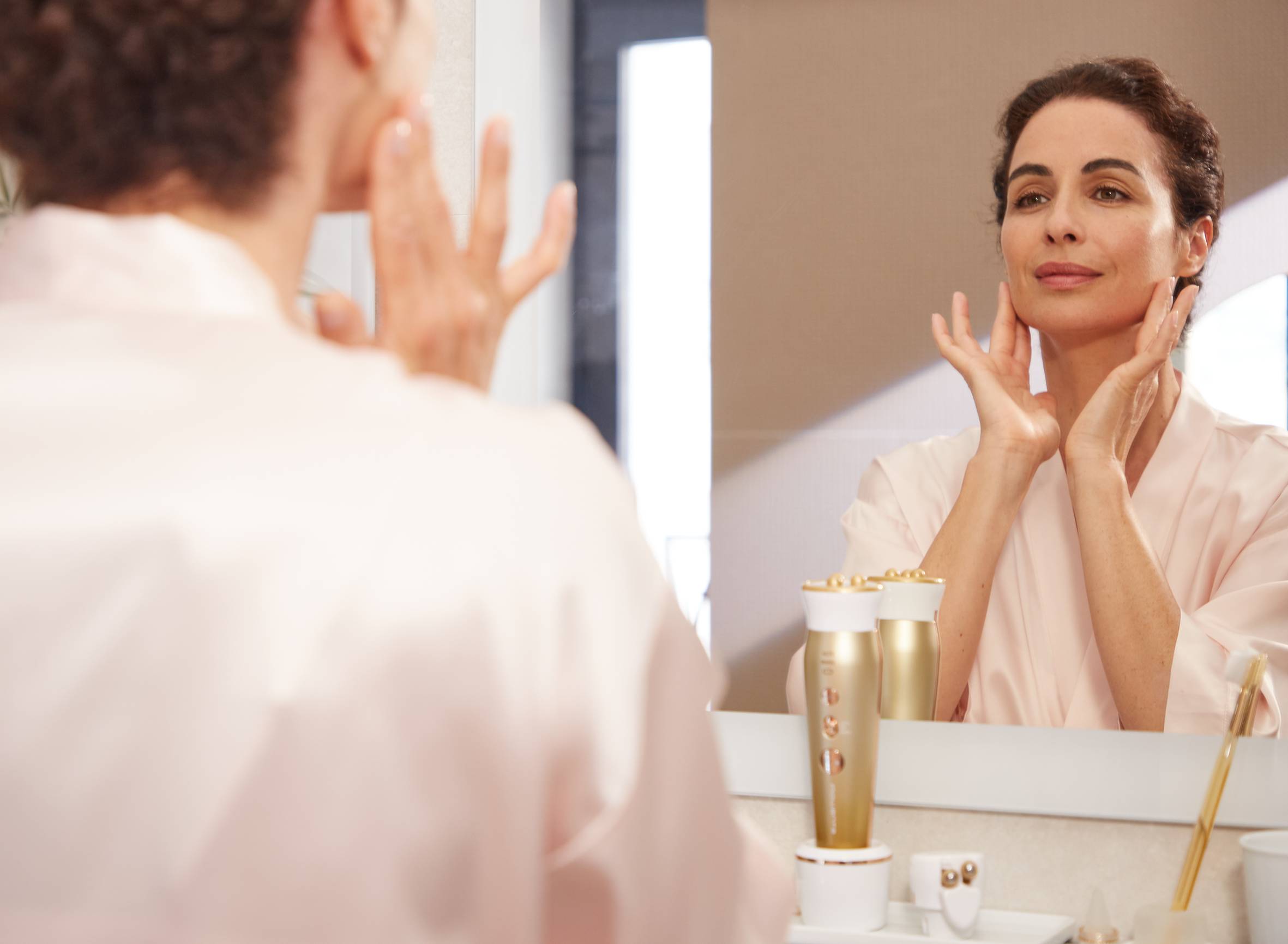 *4 beneficios antiedad clínicamente probados: piel radiante, tono homogéneo, brillo y firmeza.